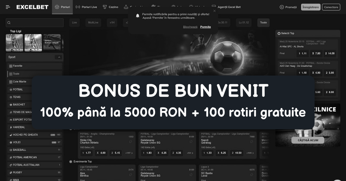 ExcelBet Casino vă invită să descoperiți lumea fascinantă a jocurilor de noroc online în România, oferindu-vă un bonus de bun venit generos de 100% până la 500 RON la prima depunere. Cu cerințe de rulaj de doar 35x, puteți profita rapid de câștigurile obținute prin slot-urile cu plăți rapide și jocurile live cazino premium. Platforma operează sub licență de la Autoritatea Națională pentru Jocuri de Noroc din România, garantând astfel siguranța și corectitudinea fiecărei sesiuni de joc. Beneficiați de retrageri procesate în maximum 24 de ore, suport tehnic disponibil non-stop și o gamă impresionantă de peste 2000 de jocuri, incluzând slot-uri moderne, jocuri live cazino cu dealeri profesioniști și jocuri de masă clasice. Colaborăm cu furnizori de top precum NetEnt, Pragmatic Play și Evolution Gaming pentru a vă oferi experiența de joc cea mai captivantă. Platforma mobilă optimizată vă permite să vă bucurați de jocurile favorite oriunde vă aflați, iar metodele diverse de depunere și retragere includ cardurile bancare, portofelele electronice și transferurile bancare instantanee.
